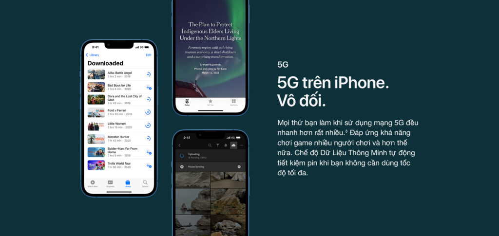 1Cần có gói cước dữ liệu. Mạng 5G chỉ khả dụng ở một số thị trường và được cung cấp qua một số nhà mạng. Tốc độ có thể thay đổi tùy địa điểm và nhà mạng. Để biết thông tin về hỗ trợ mạng 5G, vui lòng liên hệ nhà mạng và truy cập apple.com/iphone/cellular.